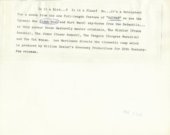 Ce tirage argentique vintage de Batman est un tirage de promotion du long métrage réalisé par Leslie H. Martinson. Un timbre dateur et une légende tapuscrite contrecollée figurent au dos de l’épreuve. Le texte débute dans un style caractéristique au texte publicitaire de l’époque : « Est-ce un oiseau ? Est-ce un avion ? Non… C’est un Batcopter ! » Il ne manque plus que la voix nasillarde et la musique…