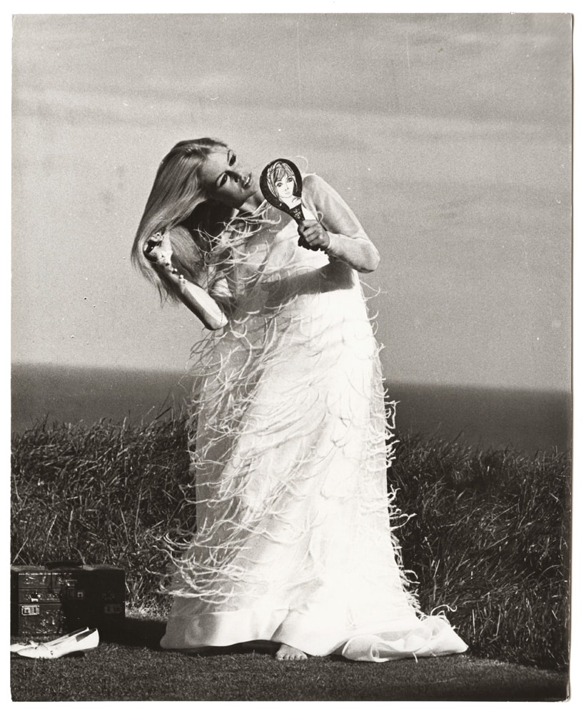 Dos à l’horizon marin, Brigitte Bardot apparaît ici dans une posture à la fois intime et théâtrale. Dans une dimension presque irréelle et éternelle. La robe blanche, animée par les éléments, semble presque se dissoudre dans l’espace. Tandis que le miroir renvoie une image intime, presque méditative. Ce même miroir, si caractéristique, que Catherine Deneuve utilisera à son tour lors du tournage de Mayerling en 1968…