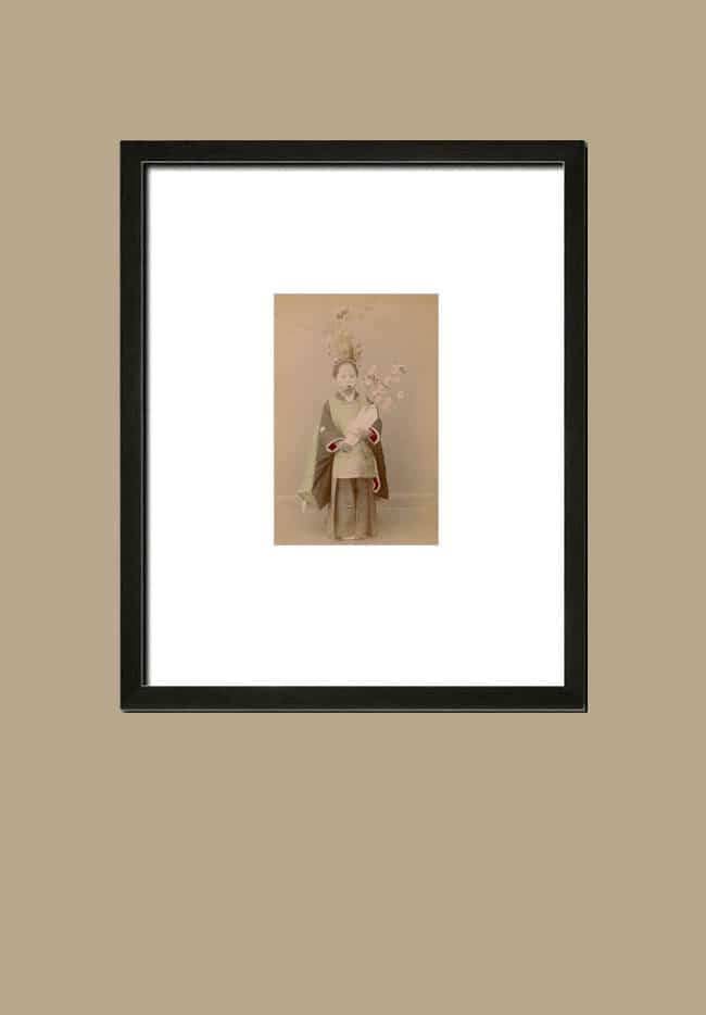 Ce présent tirage albuminé, contrecollé sur son carton d’origine, est rehaussé de couleurs, à la main. Des artistes spécialisés étaient souvent employés dans les grands studios photographiques de Yokohama ou de Tokyo. Ils appliquaient avec une précision méticuleuse des pigments pour donner vie aux kimonos, ornements floraux et personnages, comme cet enfant Chigo.