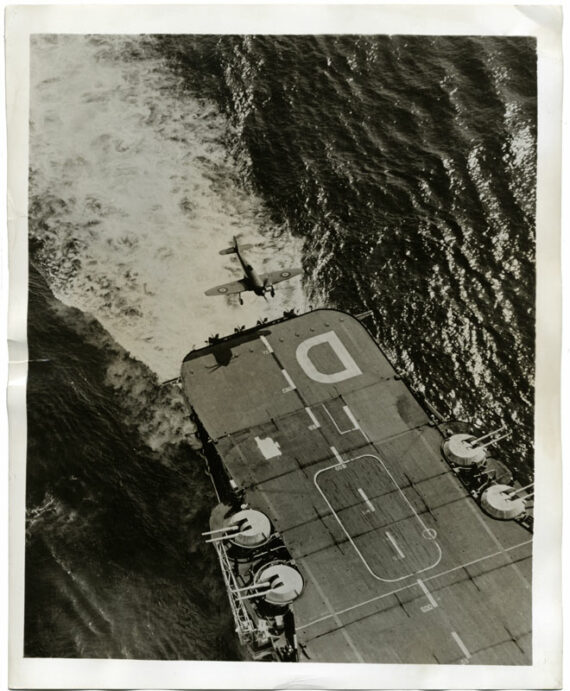 Cette photographie a été diffusée à l’origine pour illustrer la qualification de l’avion britannique sur porte-avions, en 1947. Produit à la fin de la second guerre mondiale, le Hawker Sea Fury X est un avion qui se fera remarquer notamment pendant la guerre de Corée, à l’occasion du soutien britannique dans la région.