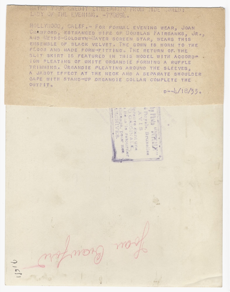 La légende au dos de ce tirage de presse diffusée en 1933 ne s’intéresse d’ailleurs qu’à la robe de Joan Crawford. Sans prendre la peine de mentionner ni le film Captive (titre en français), ni Adrian Adolph Greenberg (1903-1959).