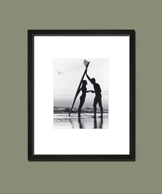C ette photographie nous offre une scène iconique de la culture surf : les silhouettes d’une femme et d’un homme, un longboard dressé contre elles. Tandis que la lumière rase de cette fin de journée renforce l’intimité du couple, quelque part sur une plage de Californie…