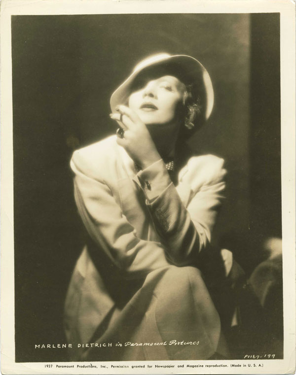 Ce sont d’ailleurs les studios de cinéma de la Paramount Pictures qui ont diffusé ce tirage de presse que nous vous proposons. Si la photo a bien été prise en 1934, une autre date – 1937 – figure dans le cartouche, sous le portrait. Probablement une erreur, due à une confusion de date ou une faute typographique. C’est même cette année-là qu’elle est naturalisée américaine, tournant ainsi le dos à une Allemagne qu’elle n’apprécie guère…