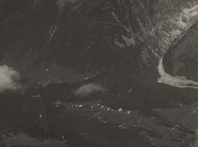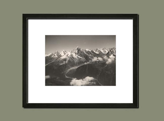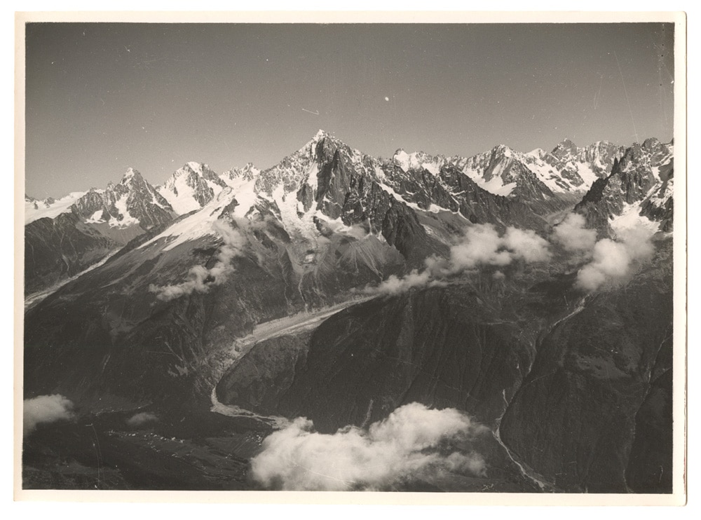 Ce cliché en noir et blanc présente un intérêt historique majeur : il fixe l’état des lieux d’un paysage alpin emblématique dans les années 30. Au centre donc, l’imposante et immuable Aiguille Verte (4 122 m). Elle s’élance vers le ciel et domine fièrement la chaîne des Aiguilles de Chamonix.