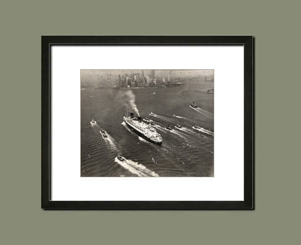 C ette photographie aérienne vintage du paquebot Liberté, entouré de remorqueurs, constitue un joli témoignage de la grande époque des transatlantiques français. Complété par cette vue panoramique mythique sur Manhattan en arrière plan.